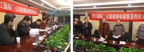 2009年1月19日,双方在川投集团1501室举行了“锦江国际”公寓楼整体销售签约仪式,集团公司三产部经理梅林、副经理薛波等领导代表集团公司出席。在友好的气氛中,房地产公司法人代表王建、委托代理人蔡昌银与四川宏凌公司法人代表冉卫东、委托代理人罗小林共同签订了锦江国际项目公寓楼《商品房买卖合同》和《备忘录》。二月初,已收到宏凌公司支付的第一批购房款。至此,“锦江国际”项目在2009年初成功实现了公寓楼整体销售,在全球房地产行业的隆冬时节实现了开门红,销售所得资金将进一步确保2009年项目顺利完工。
