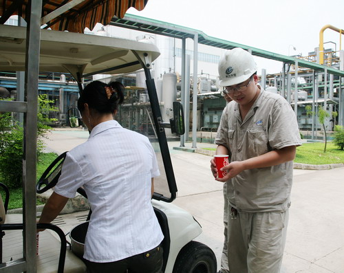 三是坚持“以人为本”,加大防暑降温的资金投入,不断改善员工工作环境,加强后勤保障工作。为了给现场一线操作人员送去夏日清凉,公司为6号厂房配置露天太阳伞,有效减少了阳光直射,降低温度;将闲置空调安装到现场精馏工段休息室。为防止员工中暑,公司为员工发放藿香正气水及人丹防暑降温药品,每天为一线各岗位运送清凉饮料。