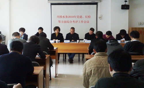 2010年12月1日下午,根据川投党委统一安排,川投水务接受了川投集团所属企业2010年度党建、纪检等方面综合考评第三组就企业党建、党风廉洁建设、维护稳定和社会治安综合治理等方面的综合考评。考评组由组长刘晓灵,成员王军、姚建军、贾英组成,川投水务本部全体员工和所属公司员工代表共计25人参加了考评会议。
