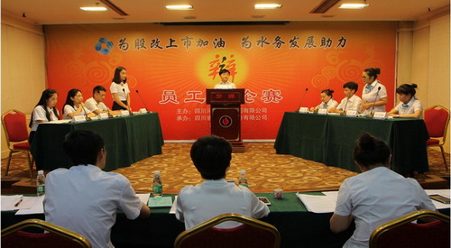 为扎实推进精神文明建设,助力川投水务股改上市与稳健发展,进一步锤炼员工逻辑思维能力和口头表达能力,川投水务于9月11日至14日在川投水务宏源燃气公司11楼会议室举办了以“为股改上市加油.为水务发展助力”为主题的2016年员工辩论赛。川投水务总会计师祝瑗、总经理助理兼综合部经理杨志刚出席了本次员工辩论赛。川投水务本部及所属8家子公司共10支队伍及相关人员59人参加了此次辩论赛。