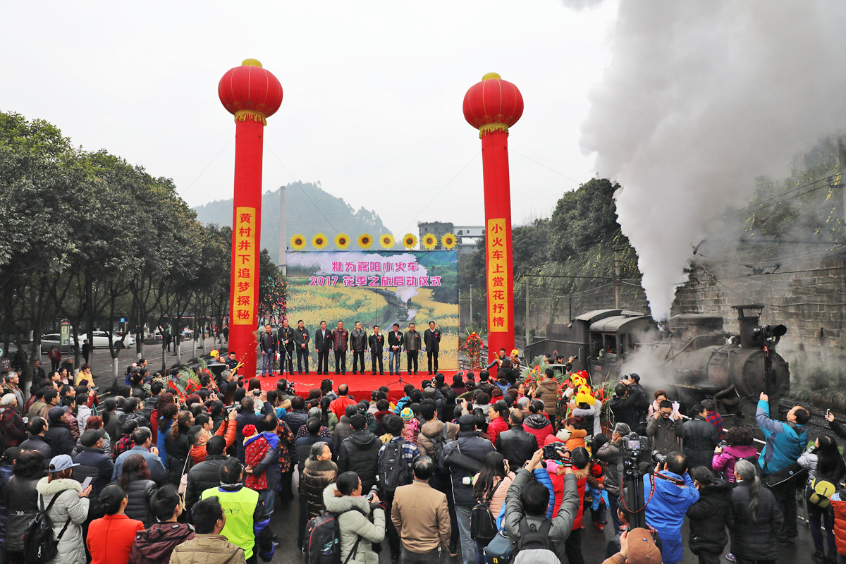 仪式由川投峨旅公司总经理杜勤主持。市、县、嘉阳集团相关领导出席了当天的启动仪式,省、市、县十余家新闻媒体进行了现场报道。在喜庆、精彩的歌舞表演之后,川投峨旅公司董事长方俊贤发表了热情洋溢的致辞,乐山市旅体委副主任薛润国宣布:“犍为嘉阳小火车2017花季之旅正式启动!”
