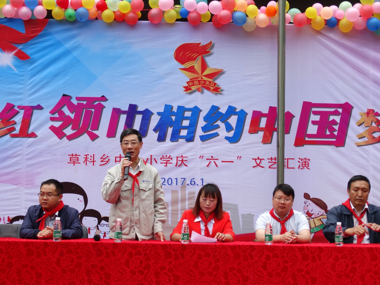 6月1日上午,田湾河公司总经济师、董事会秘书段明代表公司与草科乡中心小学全体师生在校园操场一起共庆一年一度的“六一”儿童节。