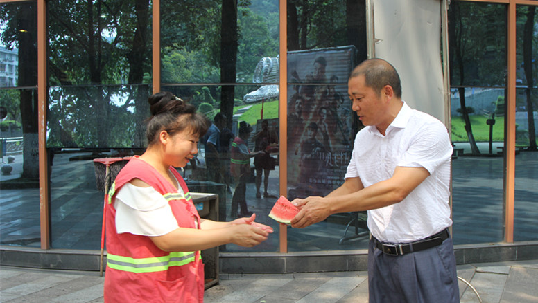 8月1日下午,嘉阳集团总经理、党委副书记范勤英,总经理助理刘波带领机关三支部的部门负责人先后看望慰问了综合服务公司的环卫工人和煤坝上作业的职工。在嘉阳矿山公园主碑广场,范总经理不仅为环卫工人们切西瓜,还挨个递到大家手中,感谢大家为矿区的环境卫生所付出的辛苦劳动。慰问组还前往炭坝,看望慰问正在安装环保治理排污管道的综修队职工和炭坝工人,职工激动地说,“感谢公司领导和机关党员同志们的关心,请你们放心,我们一定全力做好煤坝的安全管理,完成好公司煤炭销售任务。”