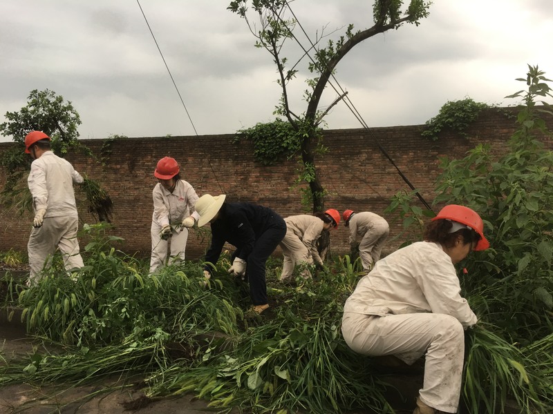 第二天(8月4日)早上8:00,29名党员志愿者们又集结在办公楼下,虽然经过前一天的劳动,大家都非常疲惫,但没有一个人打“退堂鼓”,在公司领导的带领下继续奋战,穿梭忙碌的身影形成了一道亮丽的风景线,劳动一直持续到中午12点……经过两个半天的辛勤劳动,7000平方现场的杂草被全部清理干净,运送杂草7卡车近4000公斤。