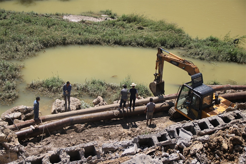 9月6日清晨6:00雨水降缓,万源公司总经理王文川第一时间来到现场,看到河水水位已稳定且有下降趋势,正式下达开工命令。开挖塌方、填石铺路、重新布管,抢险工作一步一步按照计划实施。