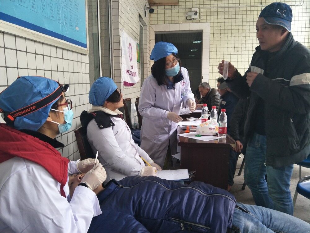 笔者在嘉阳煤矿井口看到,5名医务人员分工合作,为部分抽空咨询的职工服务,进行口腔卫生宣教、问卷调查(收集一般信息、生活习惯、口腔健康行为意识等内容)、唾液收集(分析唾液细菌成分)、口腔检查(龋齿病、牙周病等患病情况)。