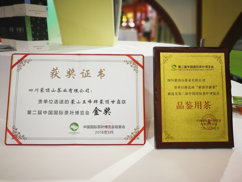 继2017年第一届中国国际茶叶博览会“蒙顶山茶”公用区域品牌荣获“全国十大茶叶品牌”之后,2018年5月19日,在第二届中国国际茶叶博览会第八届国际武林斗茶大会上,四川蒙顶山茶业有限公司“蒙山五峰牌蒙顶甘露”在全国送选的茶叶产品中脱颖而出,荣获第二届中国国际茶叶博览会金奖,并选定为第二届中国国际茶叶博览会品鉴用茶。