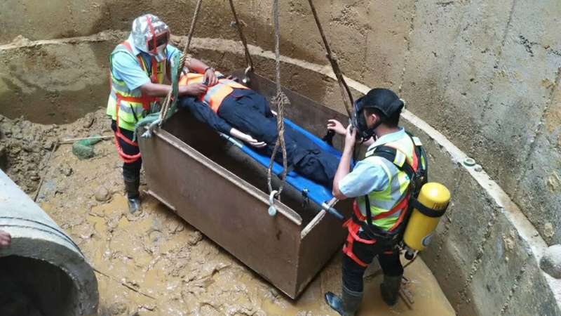 演练活动中,现场用假人模拟工作井内伤员,然后由安全救援队员佩戴有限空间救援装备,从扶梯下至工作井内将伤员固定在担架上,并通过井外吊车协助将伤员运出工作井。当伤员被运到地面后,救援队员马上对伤员进行医疗设备供氧和心肺复苏等救援行动。