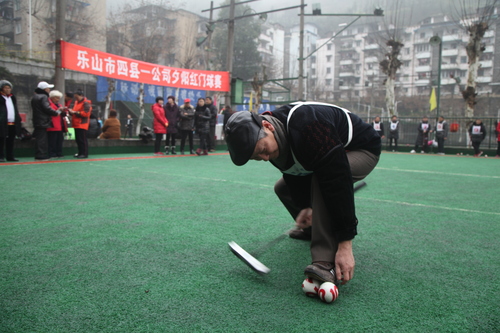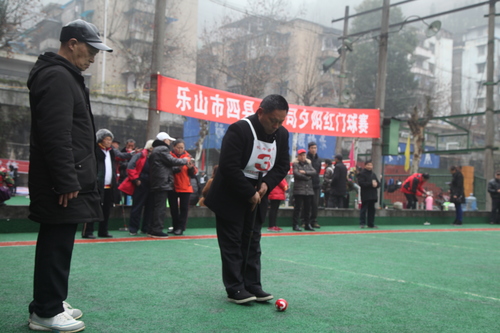 将拳头大小的球置于入场线上,瞄准第一个小小的球门,小心翼翼地推杆,球静悄悄地穿过球门,裁判员随之举起戴着雪白手套的双手,吐出清脆的声音:“一号球员一门得分,继续”……3月1日,乐山市四县一公司“夕阳红”门球赛在嘉阳矿山举行,来自犍为县、沐川县、马边县、夹江县和嘉阳集团老体协的十四支代表队共150名退休老职工参加了此次比赛。