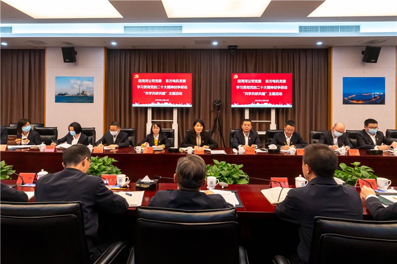 11月21日,田湾河公司党委与东方电机党委在德阳东方电机厂联合开展学习贯彻党的二十大精神“共学共研共建”主题活动。东方电机有限公司党委书记、董事长王军,党委副书记、总经理鄢志勇,党委副书记、工会主席徐学文,副总经理、总工程师梁权伟;公司党委书记、董事长李红,党委副书记、总经理杨超龙,党委副书记、工会主席杨坤,副总经理伍超。公司与东方电机相关部门人员参加活动。
