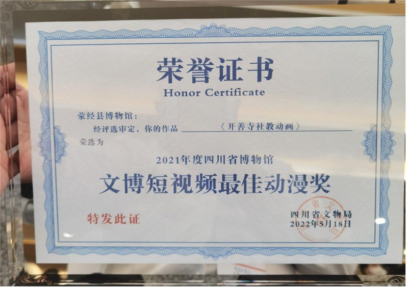 游客们打开手机即可获取博物馆介绍、地理位置、游览须知等信息,还可在线观赏精品文物和视频,通过VR沉浸式云游博物馆。项目还通过对可移动文物数字化成果的活化利用,深挖荥经县博物馆的历史文化遗产资源,建设了一系列荥经县博物馆特色的展示内容,践行了让文物活起来的使命,受到社会公众的一致认可。其中,《开善寺社教动画》经网络投票、专家终评,荣获2021年度四川省博物馆“文博短视频最佳动漫奖”。