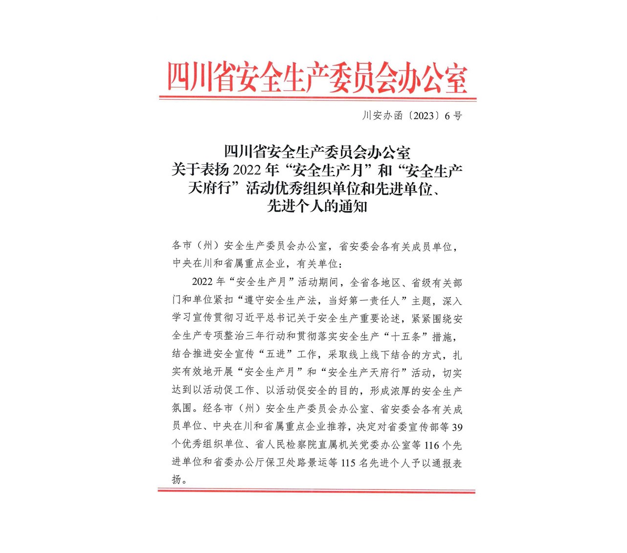 近日,四川省安全生产委员会办公室发布《关于表扬2022年全省“安全生产月”和“安全生产天府行”活动优秀组织单位和先进单位、先进个人的通知》(川安办函〔2023〕),川投信产所属宏明电子获得先进单位称号。