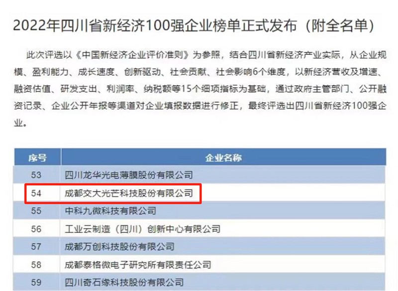 近日,四川省工业和信息化研究院发布“2022年四川省新经济100强企业榜单”,川投能源所属交大光芒成功获评入围,标志其位居四川省以新技术、新产业、新业态、新模式为特征的新经济企业的前列。
