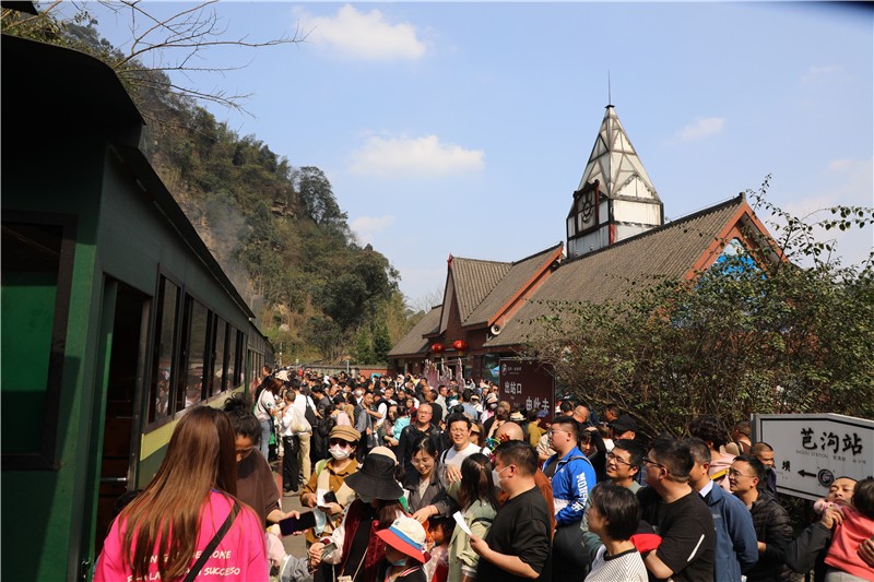 阳春三月,菜花金黄,一列冒着蒸汽、吐着白烟的小火车带着“呜呜”的汽笛声从花丛中穿过,于是山被唤醒了,花儿们竞相开放争奇斗艳,水被唤绿了,映照着蓝天上的朵朵白云。这列“比熊猫还要珍贵”的蒸汽小火车吸引着四面八方的游客,于是乐山周边县市的携妻带子之旅、川内各地的呼朋唤友之行、国内外旅行社嘉阳小火车赏春之程……游客们纷踏而至。游客接待中心,跃进站、芭蕉沟火车站、黄村井观光矿井,芭蕉沟大街小巷,到处挤满了前来观光的人群。“一票难求、一餐难求”,嘉阳景区旅游火得发烫。