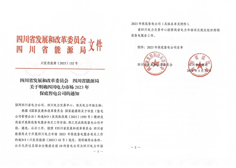 3月22日,四川省发展和改革委员会、四川省能源局印发了《关于明确四川电力市场2023年保底售电公司的通知》(川发改能源〔2023〕132号),四川川投售电有限责任公司被评定为四川电力市场2023年保底售电公司。
