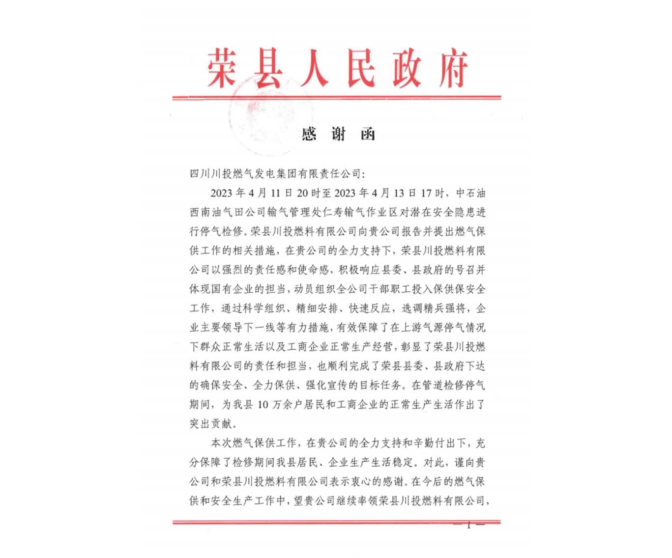 4月23日,川投燃电收到荣县人民政府发来的感谢函,对川投燃电及所属荣县川燃公司在中石油西南油气田公司输气管理处仁寿输气作业区管道检修停气期间有效保障荣县10万余户居民和企业正常生产生活所作出的重要贡献表示衷心地感谢。