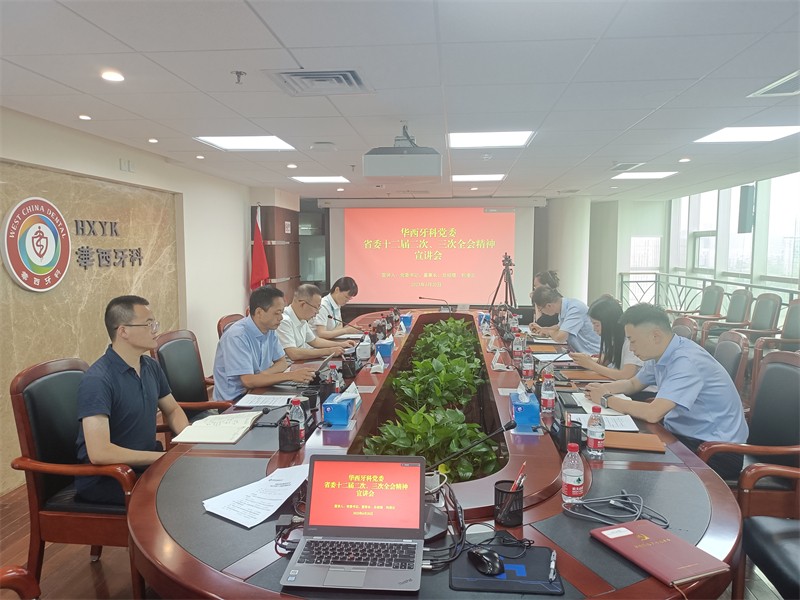 6月20日,华西牙科党委组织召开专题会议,传达学习省委十二届二次、三次全会精神。华西牙科党委书记、董事长、总经理刘凌云主持会议,党委副书记、工会主席金晶,党委委员、副总经理刘云戈,副总经理李景雨以及各党(总)支部书记、支部委员15人参加会议。