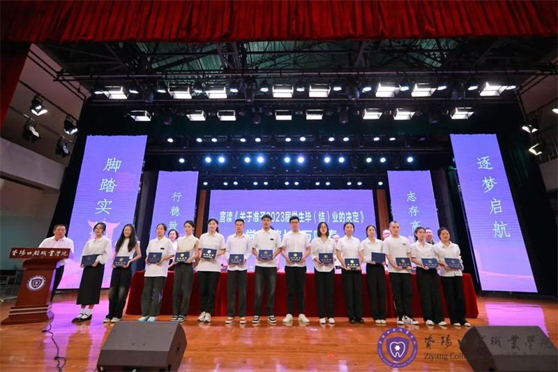 院长万呼春宣读《资阳口腔职业学院关于准予2023届学生毕(结)业的决定》,党委副书记李晓东宣读省级、校级优秀毕业生表彰决定。