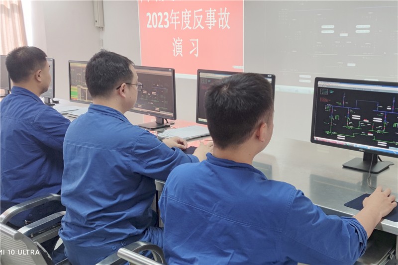 本次演练模拟双机满负荷运行时脱硫6KV I段因进线电源电缆故障引起6KV I段母线失电事故。“汇报值长,脱硫6KV I段母线失压,原因尚未查明,6KV I段所属设备全部跳闸,需要立即降低1、2号机组负荷配合进行事故处理。”随着一阵急促的声音响起,事故演练正式开始。演练开始后,脱硫主值班员立即着手进行事故处理,汇报值长请求支援,通知检修及时到位,安排副值班员重点监视好2号机脱硫及尿素区运行状况,令巡检积极配合检修人员就地查找原因并做好现场设备的巡视检查,在保障1号机组安全运行的同时,保证2号机组环保参数达标排放。演练人员各司其职,沉着应对,将事故影响控制在最小范围,避免事故的进一步扩大。