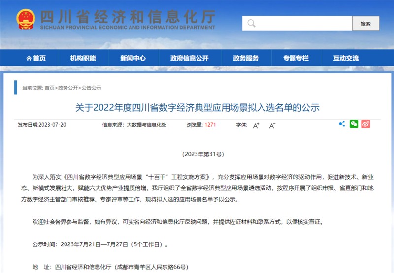 根据《四川省数字经济典型应用场景“十百千”工程实施方案》工作要求,四川省经济和信息化厅组织开展了本次数字经济典型应用场景遴选活动,并面向全省征集相关产品、技术和解决方案,经组织申报、主管部门审核推荐、专家评审后,最终产生该拟入选名单。