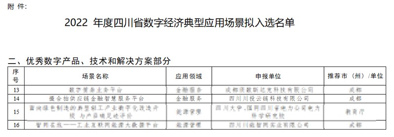 近日,四川省经济和信息化厅发布2022年度四川省数字经济典型应用场景拟入选名单,川投信产所属川投云链旗下“撮合拍供应链金融智慧服务平台”成功上榜。