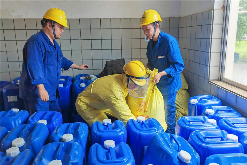 “汇报主值,循环水浓硫酸槽车接卸过程中,卸酸泵进口管道接头突然大量泄漏浓硫酸,并有少量浓硫酸洒落在围堰外,可能造成环境污染”,随着对讲机传来一阵急促的声音,演习正式开始。化水值班员发现泄漏后,第一时间切断卸酸泵电源,要求槽车司机穿戴好防护用品后关闭槽车紧急关断阀,对卸酸系统进行有效隔离后驶离至安全地带,同步疏散无关人员,并汇报值长现场浓硫酸泄漏情况。值长接到汇报后立即安排检修及运行支援人员到场协同处置,化水值班员穿戴好防护用品进入泄漏点进行系统隔离,用现场存放的消石灰封堵并中和外漏浓硫酸,冲洗围堰内泄漏余酸,并将围堰内积水转运至运行中的凉水塔,防止造成环境污染。