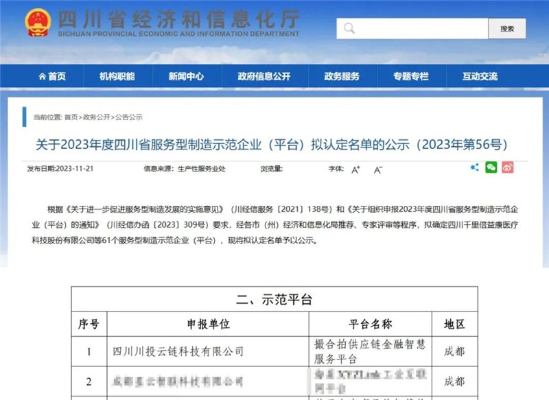 近日,四川省经济和信息化厅公布2023年度四川省服务型制造示范企业(平台)拟认定名单,川投信产所属川投云链旗下“撮合拍供应链金融智慧服务平台”脱颖而出,成功入选示范平台名单。