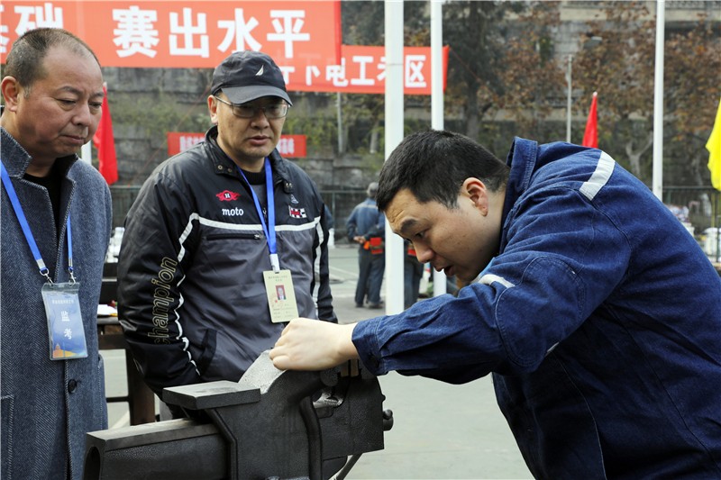 12月6日,在前期进行参考人员互评打分等工作的基础上迎来主要技术工种理论大考,各工种人员分两批入场交叉考试,严格细致的监考方式营造出了公开、公平、公正的氛围,大家认真阅题、仔细思考、沉着冷静,充分发挥自己的真实水平。12月7日,矿区文体活动场地全部变为技术比武场,场地内钳台、钻床、电气开关、电氧焊机分门别类、鳞次栉比,参考人员分4批入场,考试紧张而激烈,抢时间、追进度、保质量,大家八仙过海各显神通。