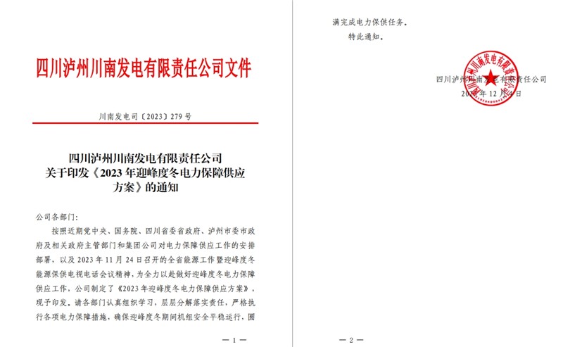 2023年入冬以来,四川电力供需处于紧平衡状态,全川燃煤发电机组能开尽开、应发尽发,其“兜底顶峰”保供顶梁柱作用进一步凸显。公司坚决贯彻落实省委省政府、省国资委决策部署和泸州市委市政府、川投集团各项工作安排,把电力保供作为当前最重要的政治任务,全面推进迎峰度冬保电各项工作。
