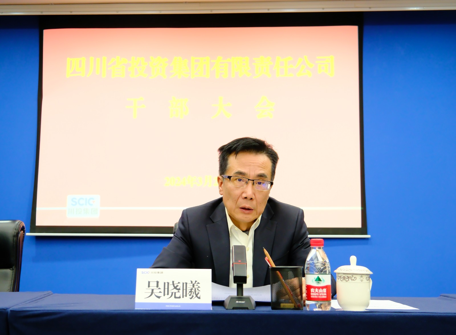 3月22日上午,川投集团召开干部大会。党委书记、董事长吴晓曦出席会议并讲话,党委副书记、副董事长、总经理李文志宣读省委、省政府关于肖长青、朱莉同志的任职通知,党委副书记、董事邓凯主持会议,在家的集团公司领导班子成员出席会议。