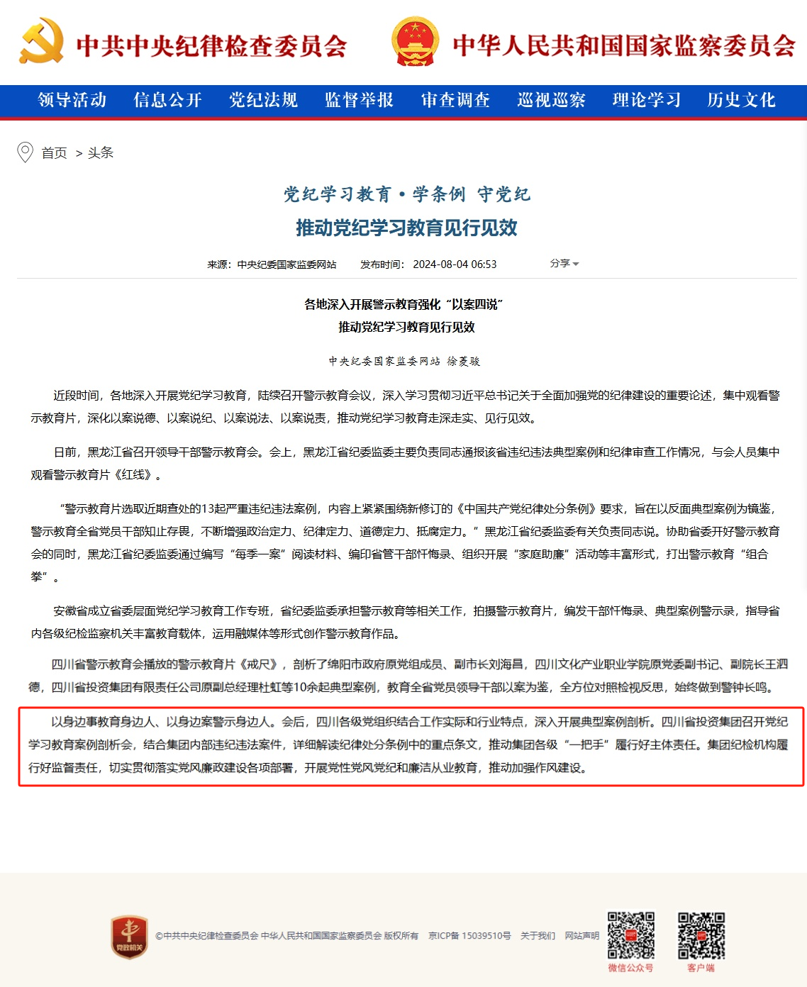 8月4日,中央纪委国家监委网站刊文《各地深入开展警示教育强化“以案四说” 推动党纪学习教育见行见效》,专题报道全国各地推动党纪学习教育走深走实的经验成效,川投集团有效做法作为唯一一例省属国企经验被“点名”介绍。