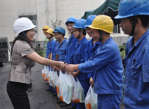 会后,在所属企业相关领导的陪同下,吴主席一行到生产车间看望慰问了正在辛勤劳动的一线员工,并送上了药品、饮料、矿泉水、茶叶等防暑降温用品,表达了集团党政工对生产一线工人的关爱之情。吴主席在生产车间、维修现场关切询问了员工的工作条件、劳动保护以及生产生活情况,嘱咐企业领导在高温酷热及双节期间合理安排工作,采取有效措施,切实做好防暑降温、劳动保护等工作,保护好广大员工的身心健康。最后,吴主席要求,企业各级工会在企业党政的带领下,充分调动广大员工的积极性,确保年度各项生产任务的顺利完成,并代表集团党政工向广大一线员工致以节日的祝福。