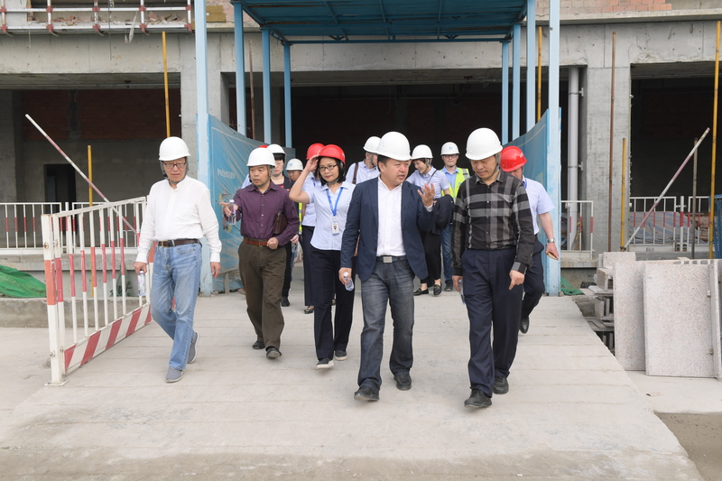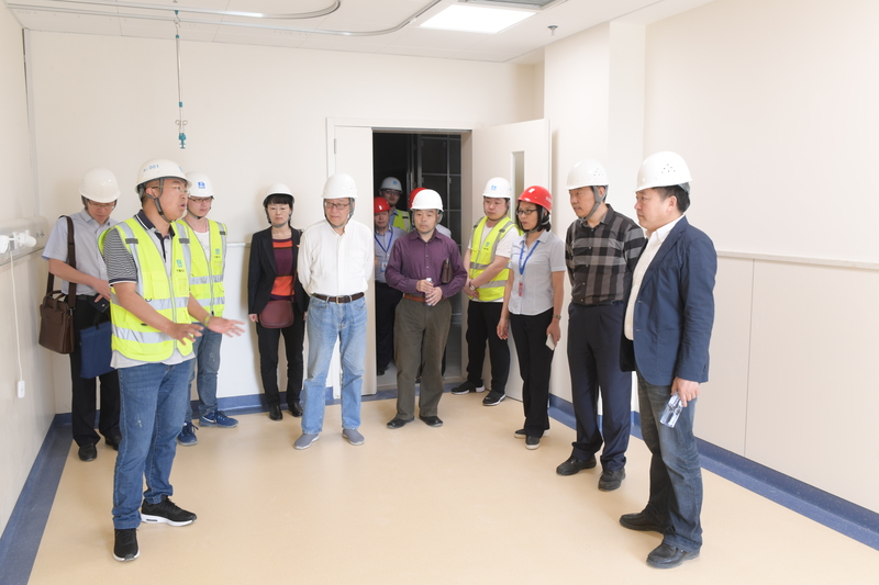 兴川建设公司总经理周守玉向蔡刚组长一行介绍了公司总体概况、工程进展情况以及党支部一年来的党建工作情况。随后,蔡刚组长一行深入住院大楼内部,详细了解暖通、给排水、消防和电气工程进展,察看病房装修情况,并不时与大家交流项目建设与管理体会。