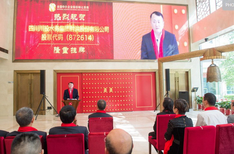 2018年5月8日,川投集团旗下的四川川投水务集团射洪股份有限公司在北京市全国中小企业股份转让系统公司举行正式挂牌仪式。省国资委党委委员、副主任宣迅,川投集团董事、副总经理李洪,射洪县委书记蒲从双,川投水务集团董事长梁有国、总经理邓锐以及省国资委产权监管处、企业改革处、办公室,射洪县委、县政府相关负责人等参加了挂牌敲钟仪式。省国资委副主任宣迅、射洪县委书记蒲从双分别致辞,对川投水务射洪公司成功挂牌新三板表示祝贺,希望继续做好民生服务和保障工作,进一步深化改革,加快国企优质资源整合,壮大国有资本上市规模。川投集团董事长代表川投水务射洪公司敲响了开市宝钟。