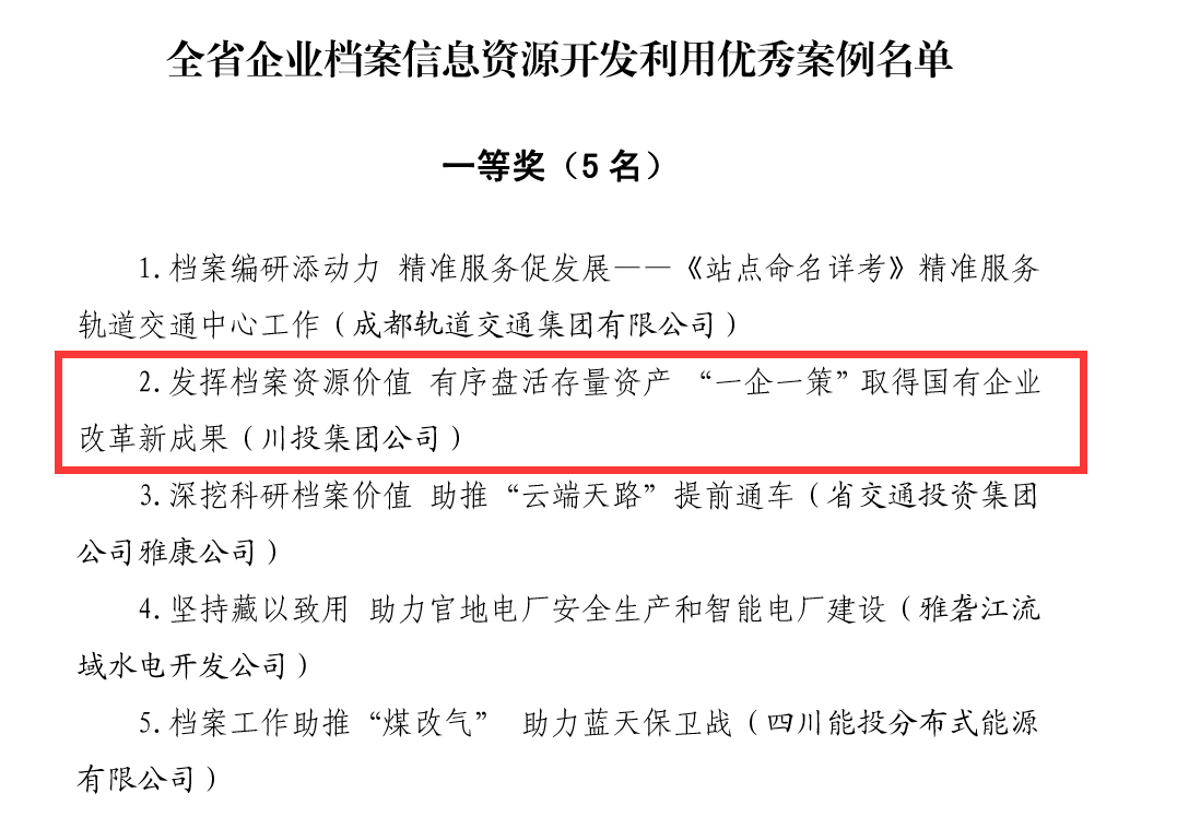 日前,四川省档案局下发《关于表扬全省企业档案信息资源开发利用优秀案例的通知》(川档发〔2019〕10号),对全省企业档案信息资源开发利用通报表彰,经过企业申报、部门审核、专家评审和省档案局研究,川投集团档案工作荣获一等奖。