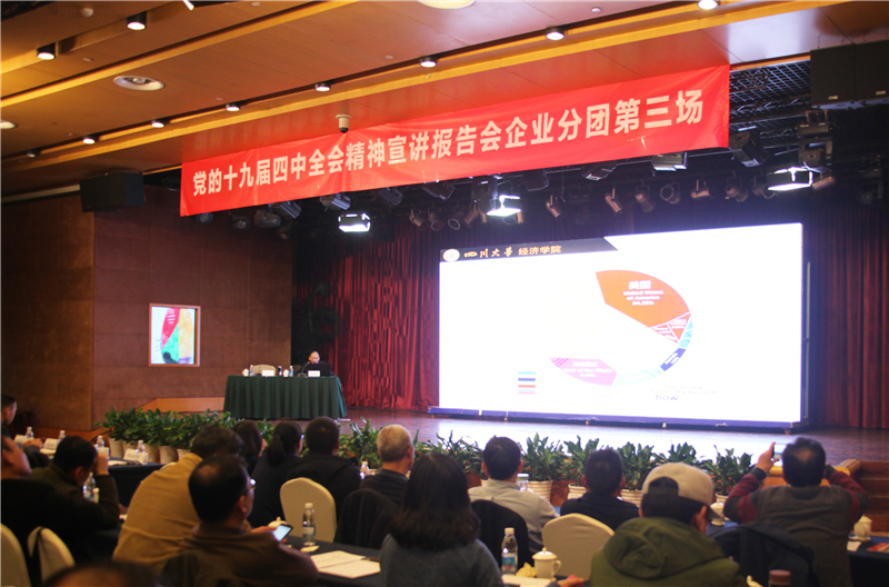 按照省国资委《关于开展党的十九届四中全会精神宣讲报告会的通知》要求,11月29日下午,川投集团作为牵头单位组织了“党的十九届四中全会精神宣讲报告会企业分团第三场”的宣讲。省委宣讲团成员、四川大学经济学院教授蒋和胜同志到场宣讲,省国资委宣传处副处长李鑫到会指导。川投集团党委副书记邓凯主持会议。