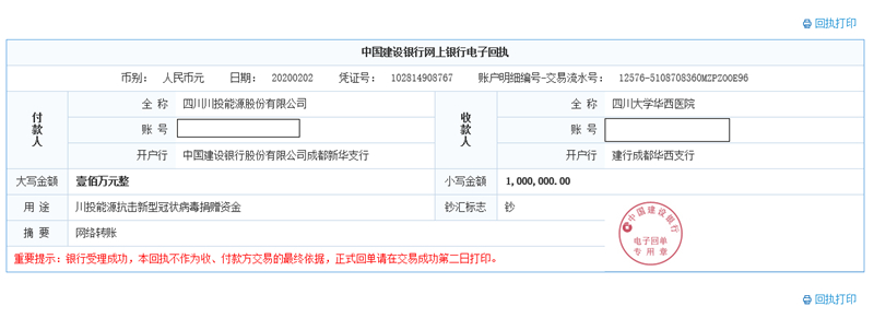 先期捐赠100万元驰援抗疫一线。当前,各医疗机构尤其是一线救治场所防护物资严重短缺,疫情防控形势严峻。川投集团组织动员旗下上市公司川投能源积极发挥上市公司示范引领作用,积极投身疫情防控工作,对疫情较为集中的一线医疗机构进行捐赠支援,最大限度提供国有企业保障支持。2月2日,川投能源向我省一线医疗救助机构——四川大学华西医院捐赠现金一百万元,专项用于本次新型冠状病毒肺炎疫情防控工作,及时满足救治患者的物资购置所需。川投能源本次100万元定向捐款,以实际行动助力打赢疫情防控阻击战,彰显国有控股上市公司的社会责任和企业公民义务。