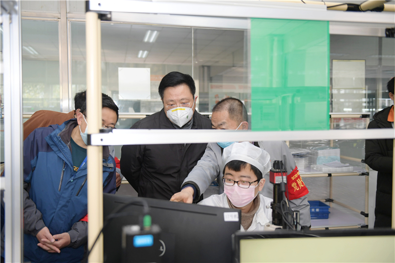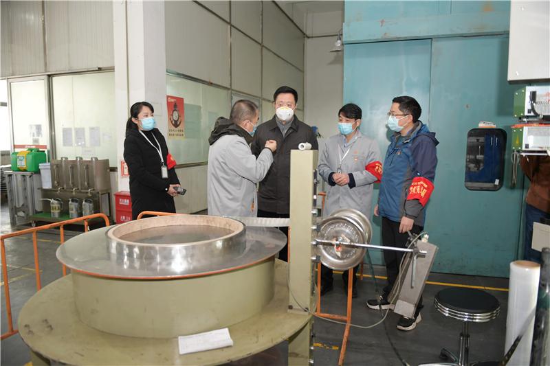 李文志总经理一行现场听取了宏明双新公司关于企业防疫、复工生产及二期项目等相关情况的汇报,详细查看了防疫期间复工方案、突发疫情应急工作预案和防疫宣传情况,实地检查了防疫物资储备室、应急防疫隔离室、生产车间和食堂等疫情防控重点区域。