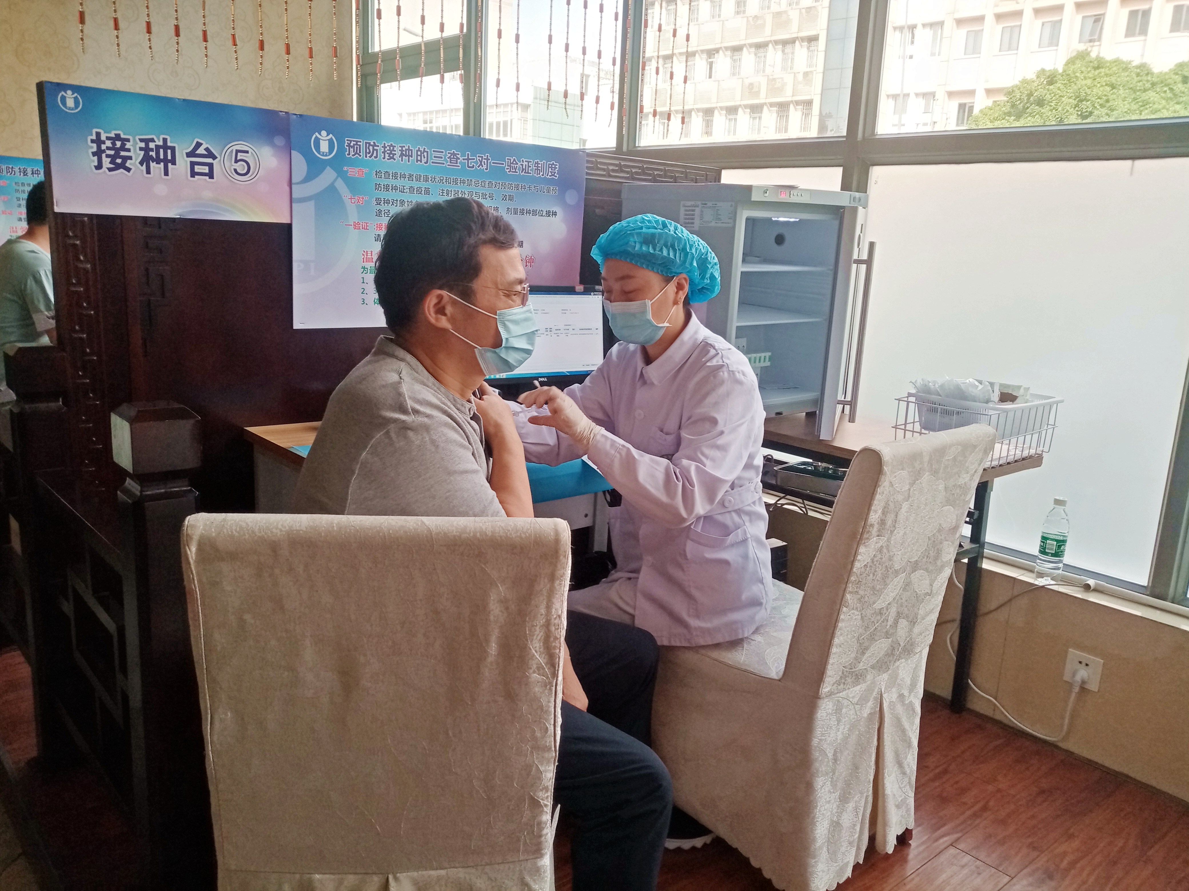 这天早上,在该社区卫生服务中心,73人早早地排上了队依次出示身份证、出示健康码、测量血压、核实登记、注射疫苗。疫苗接种工作开展得有条不紊,按顺序一步一步下来,人均不到一小时就完成了所有工作。