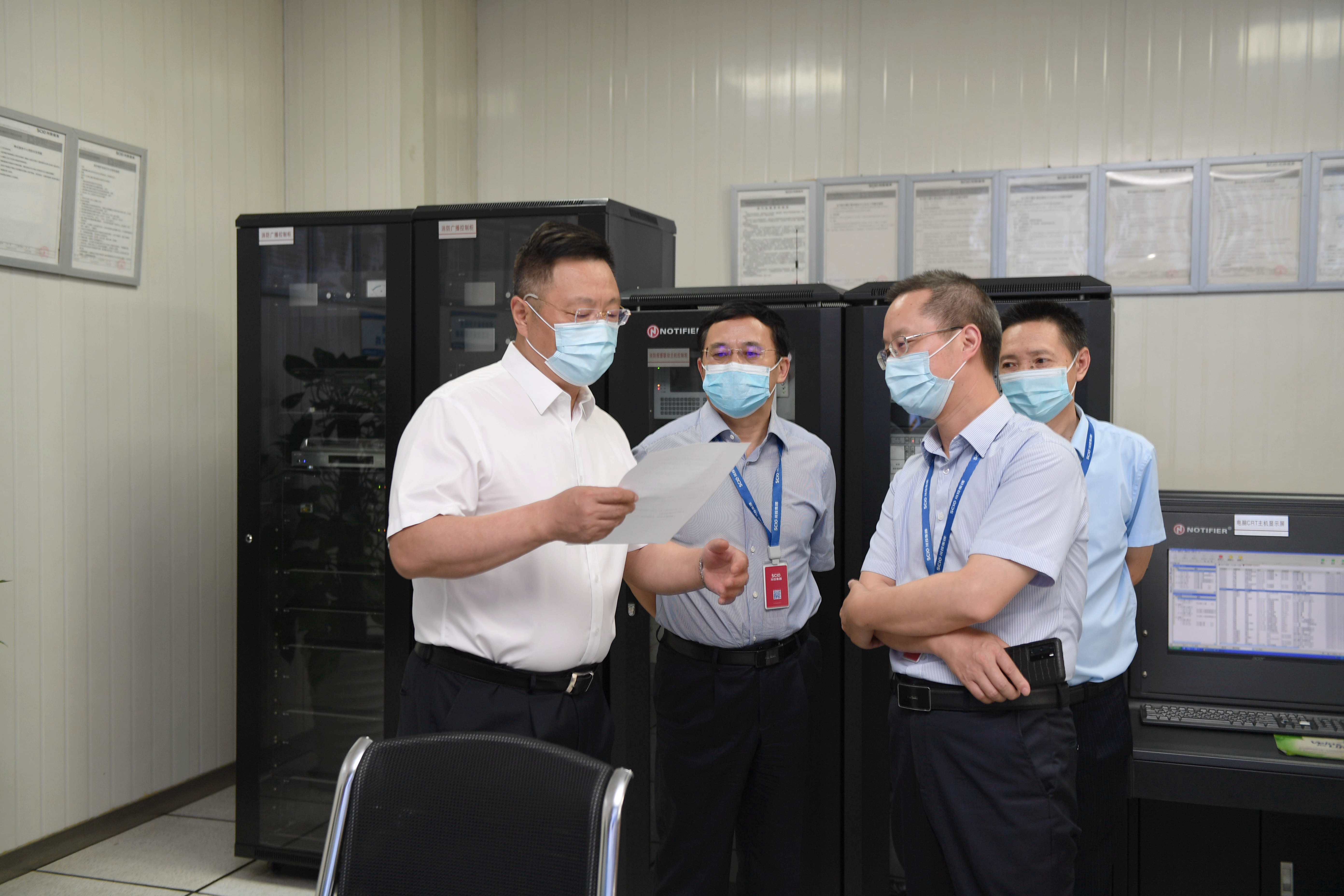 李文志、王怀林分别对川投大厦出入口、集中隔离点、职工食堂、监控室及云计算中心等重要点位进行了检查,详细查看了安全监控、环境消杀、消防物资储备等落实情况。