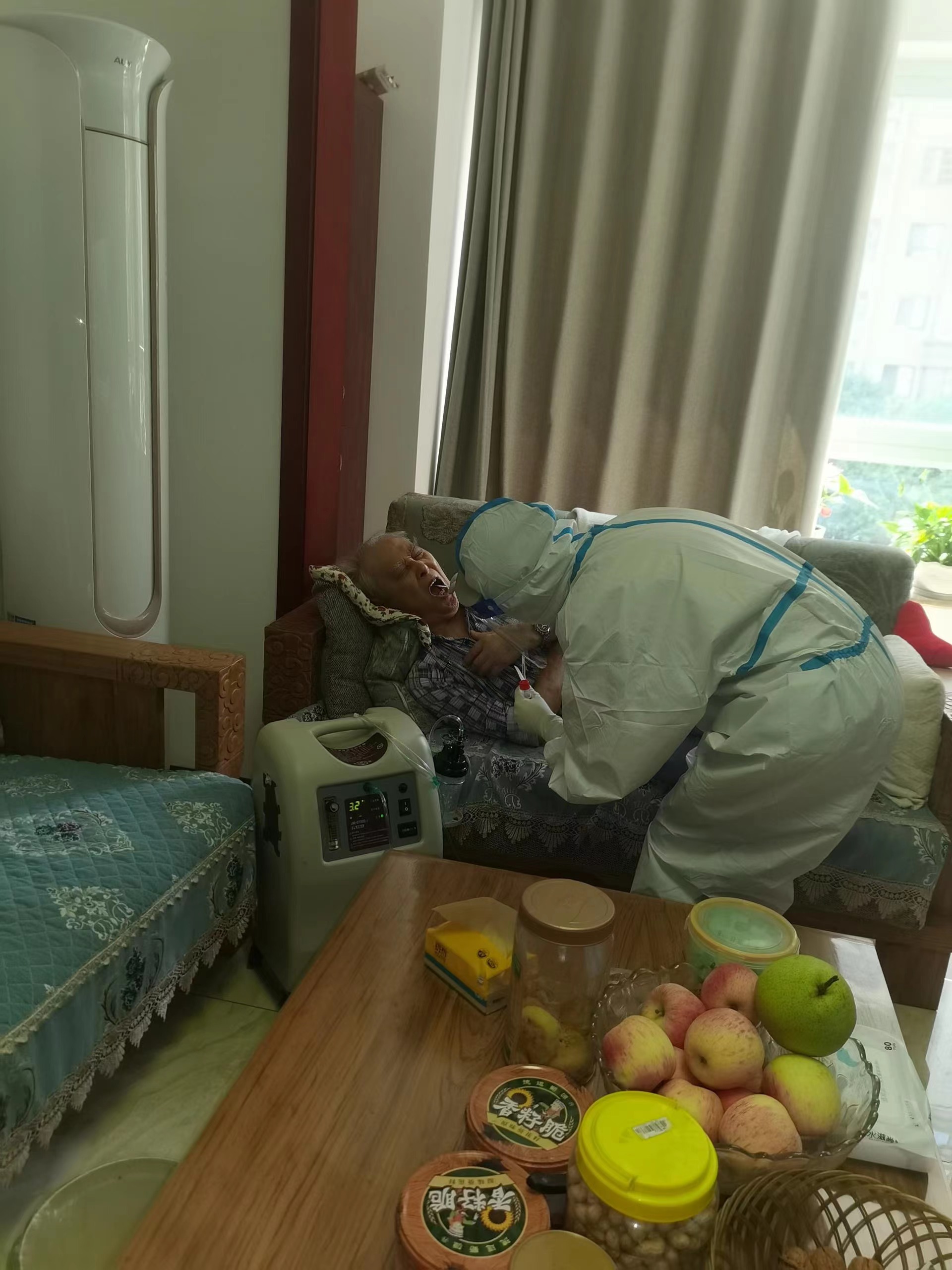 因年龄较大且患有心脏疾病,行动不便的王爷爷没能到社区规定的核酸采样点采集核酸。了解到这一情况后,正在该社区执行采样任务的袁成程利用空余时间,在社区志愿者的引导下,身穿防护服,敲响了王爷爷家的门,为他提供了上门采集服务。