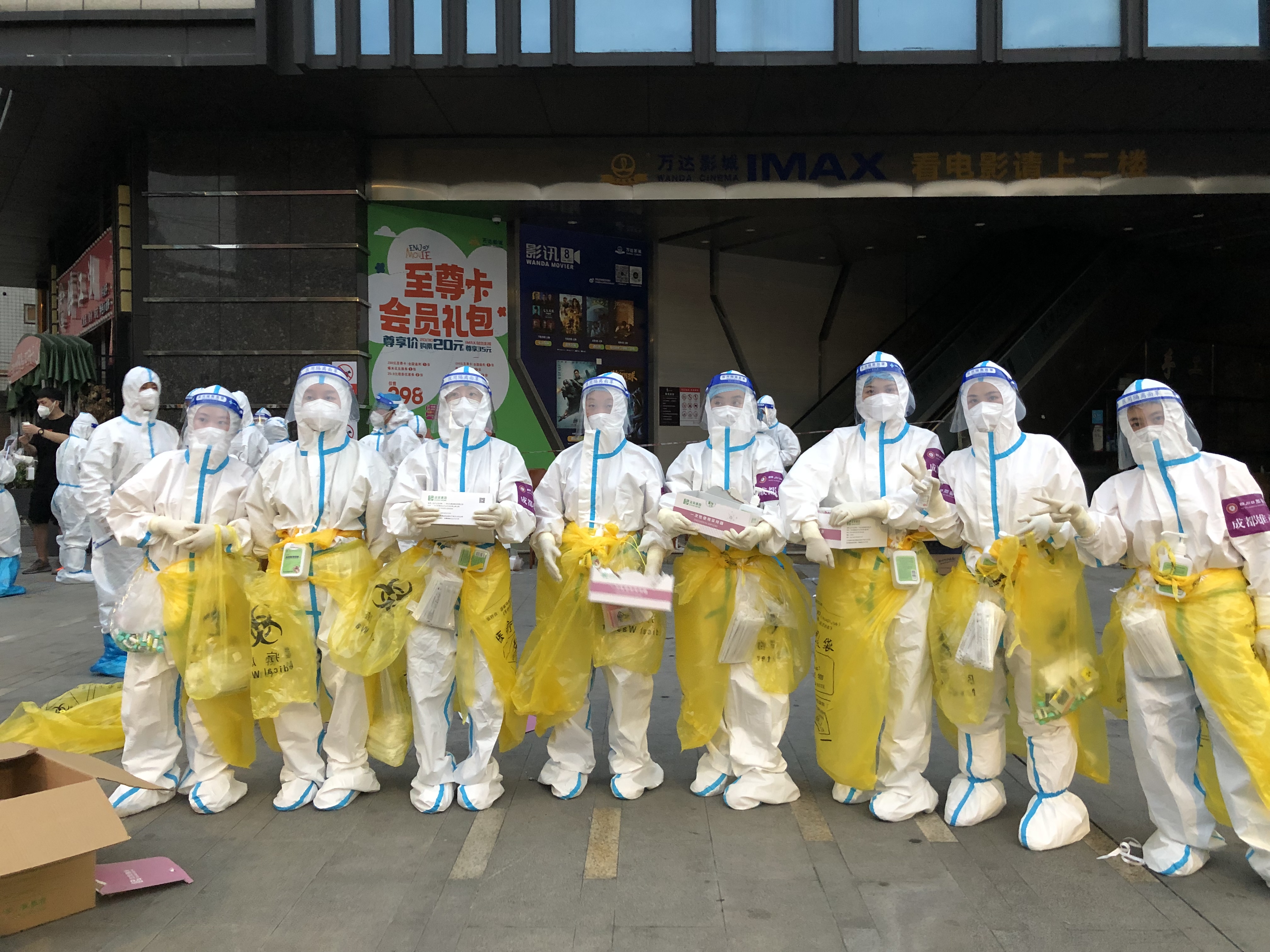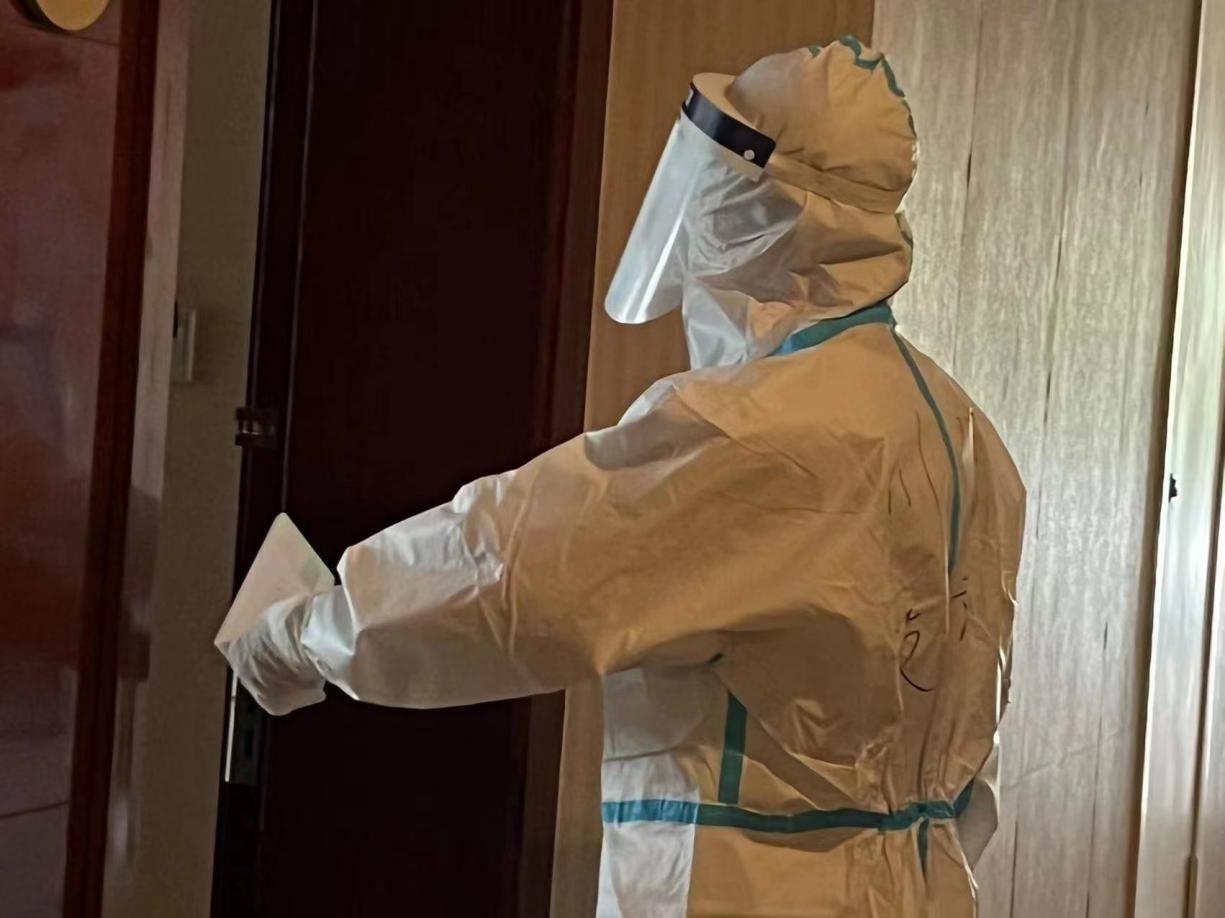 防护服——穿戴完毕;咽拭子试剂、消毒酒精、黄色医疗垃圾袋——逐一用厚厚的胶带在腰间固定。华西牙科四川口腔医院8名医务人员就开始“单兵作战”执行采样任务了。