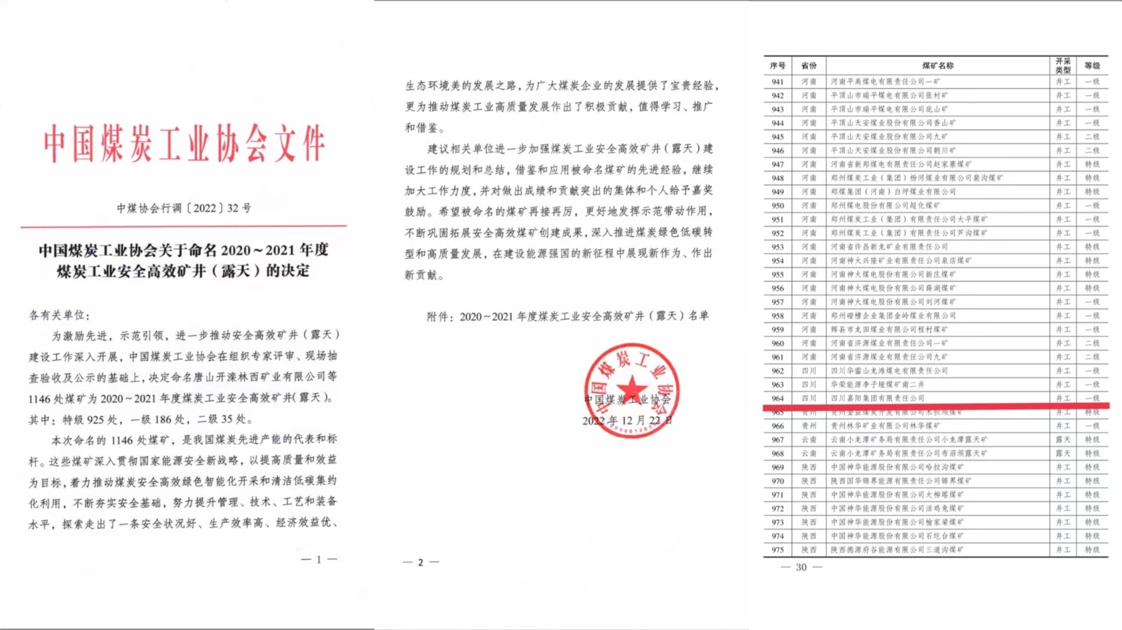 12月22日,根据《中国煤炭工业协会关于命名2020-2021年度煤炭工业安全高效矿井(露天)的决定》(中煤协会行调〔2022〕32号)文件,嘉阳集团嘉阳煤矿从全国一千一百多家煤矿企业中脱颖而出,被命名为全国煤炭工业安全高效一级矿井(露天),蝉联这一殊荣。
