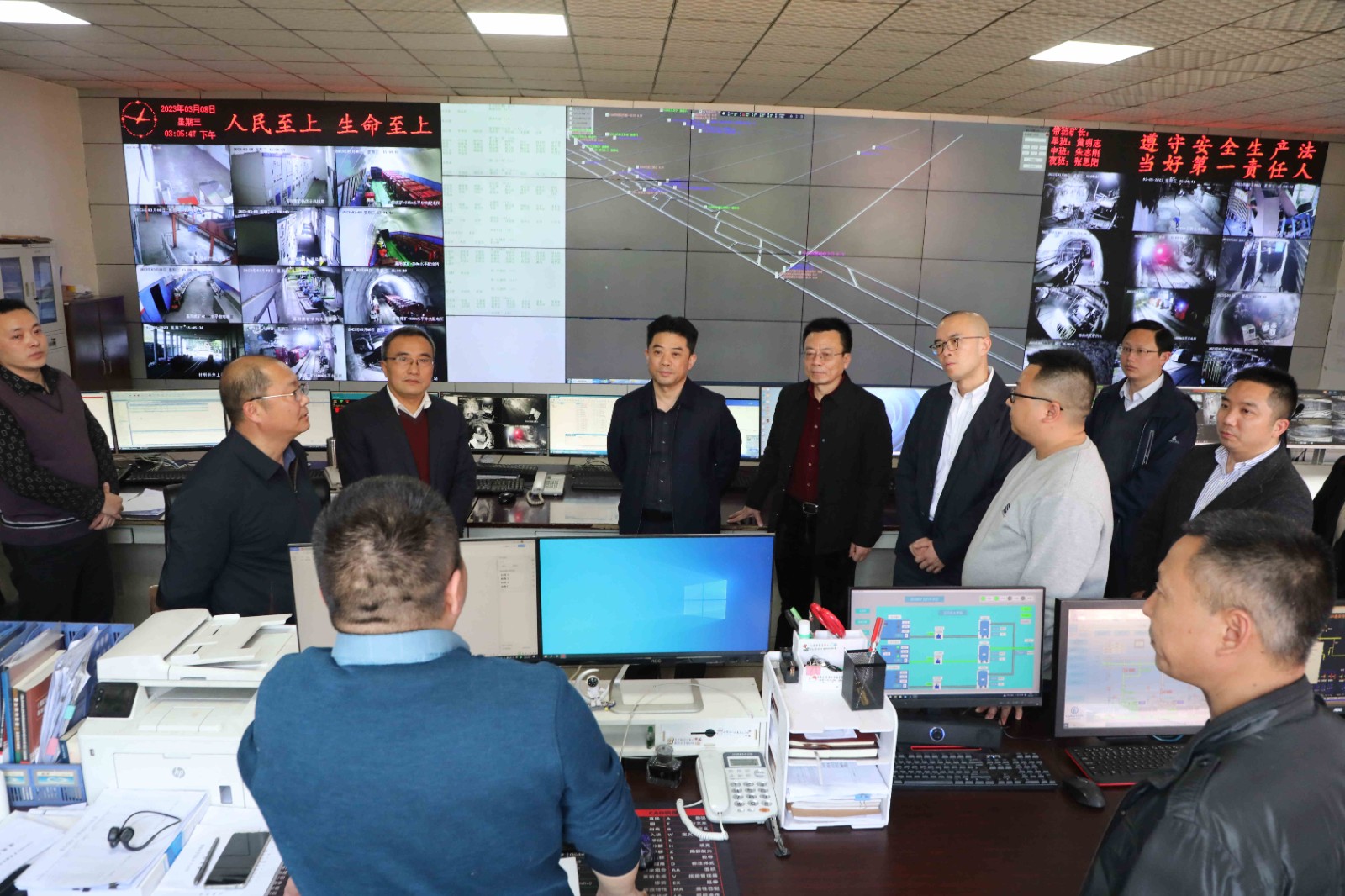 督导组一行深入矿井监控调度中心,了解安全生产、电煤保供、矿井智能化建设等情况,督导检查煤矿贯彻落实习近平总书记关于安全生产重要指示精神,两会期间安全生产工作情况等,并对调度中心工作人员岗位职责、应急处置流程等进行了提问。