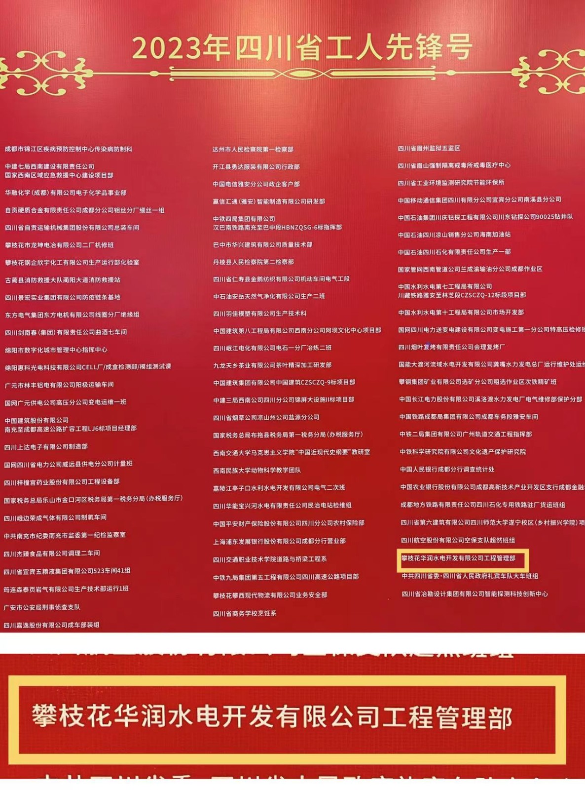 4月25日上午,2023年四川省庆祝“五一”国际劳动节暨表彰大会在成都举行。川投集团所属川投能源的攀枝花华润水电开发有限公司(简称“川投能源攀水电公司”)工程管理部被授予“四川省工人先锋号”荣誉称号。