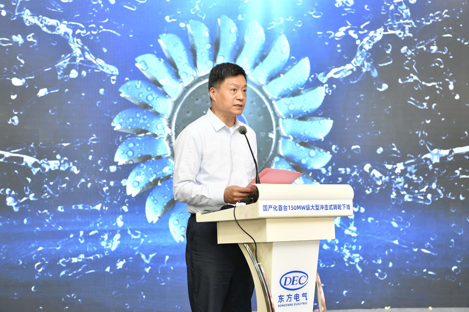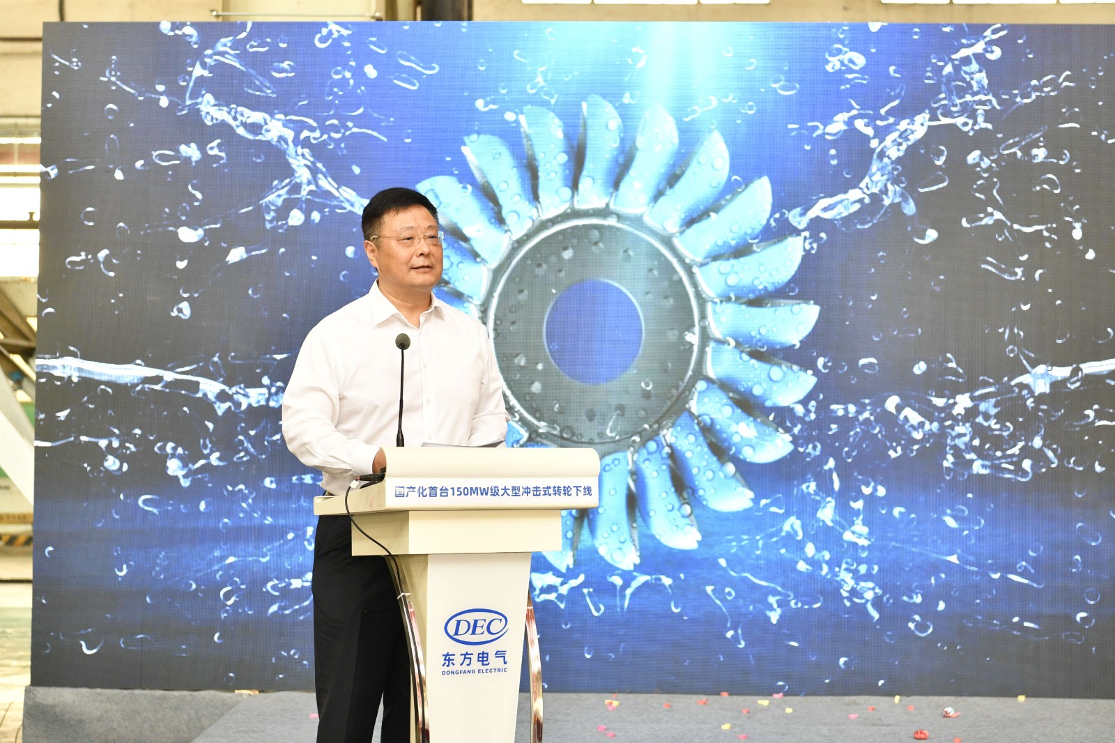 5月16日,由东方电气和川投集团联合研制的国内首台150兆瓦级大型冲击式转轮下线仪式在德阳东方电气现场举行。集团公司党委副书记、副董事长、总经理李文志出席仪式并讲话。