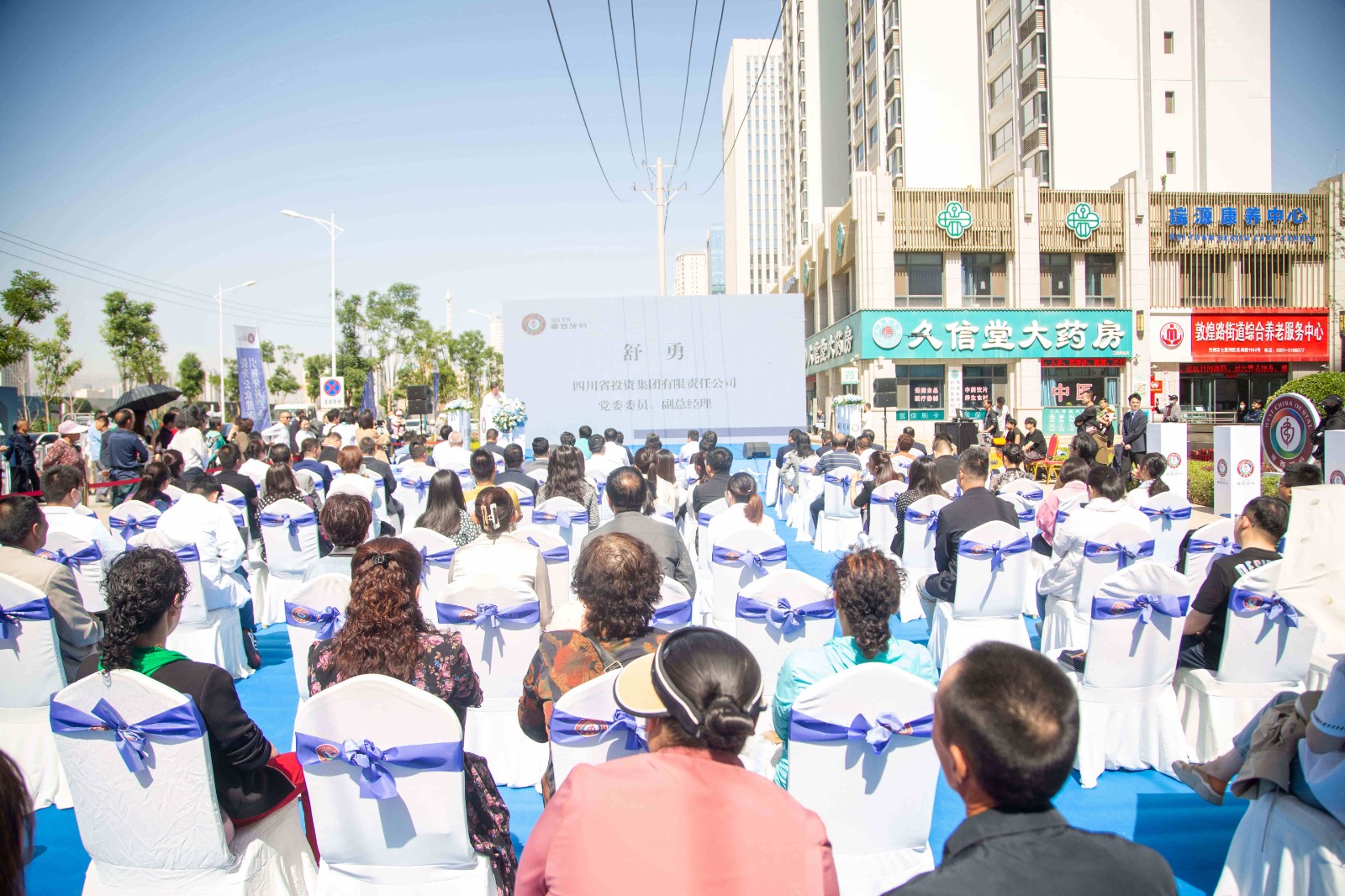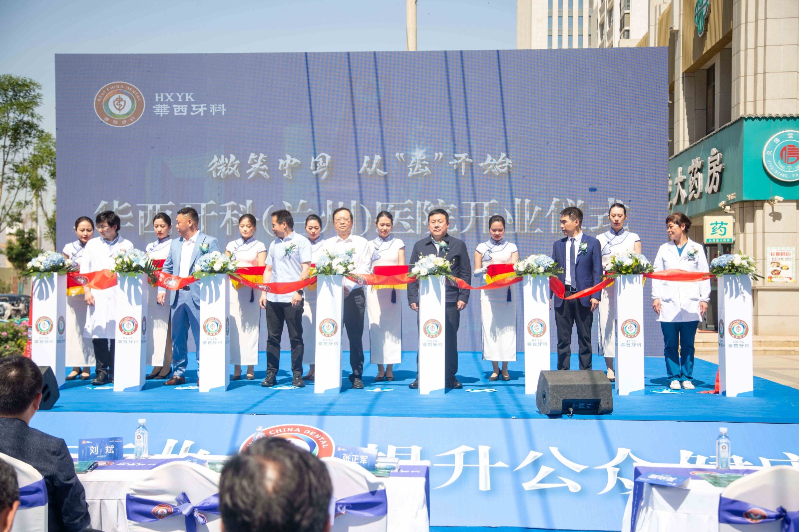 七里河区人民政府副区长刘斌,七里河区卫生健康局党组书记、局长张正军,敦煌路街道党工委书记戴巍,兰州兰石集团有限公司副总经理吴向辉,敦煌路街道党工委副书记、办事处主任唐仲海,甘肃药业集团医药大健康产业发展有限公司董事长蒋波,西北民族大学医学部党委书记郭力,白银阳明实业集团有限公司董事长路发明,甘肃省川渝商会会长吴建华,甘肃爱尔眼视光医院甘青宁大区CEO方军,兰州兰石房地产开发有限公司党委书记、总经理李元中,华西牙科党委委员、副总经理刘云戈及相关负责同志出席仪式。