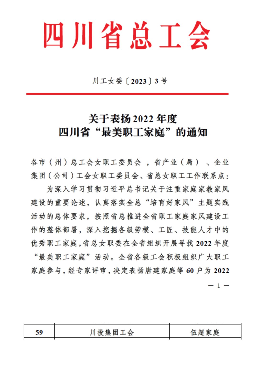 近日,四川省妇联、省文明办公布了2023年度四川省最美家庭及提名家庭名单;四川省总工会印发了《关于表扬2022 年度四川省“最美职工家庭”的通知》,川投集团均榜上有名,喜获表彰!