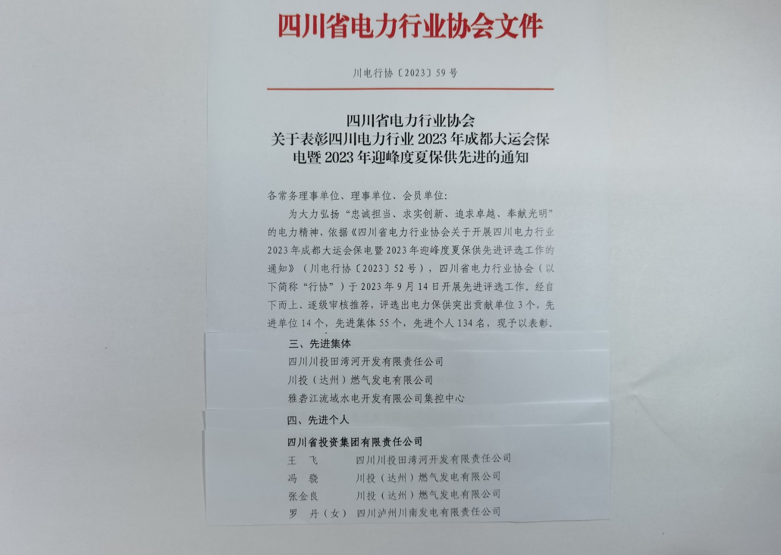 近日,由四川省电力行业协会组织开展的2023年成都大运会保电暨2023年迎峰度夏保供先进评选结果揭晓,田湾河公司荣获“先进集体”,公司员工王飞荣获“先进个人”。