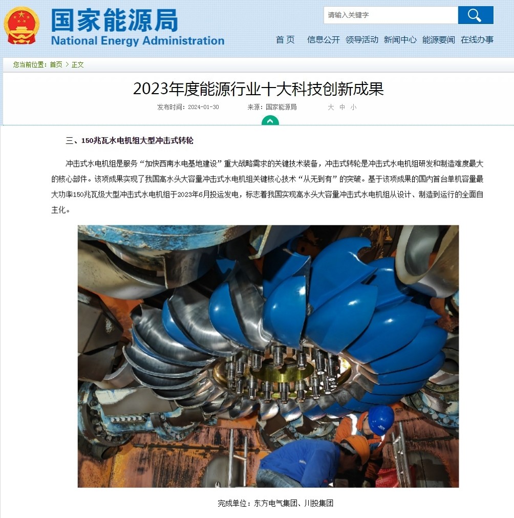 近日,国家能源局发布了2023年度能源行业十大科技创新成果,田湾河公司与东方电气集团东方电机有限公司联合研制的150兆瓦水电机组大型冲击式转轮成果位列其中。该项成果实现了我国高水头大容量冲击式水电机组关键核心技术“从无到有”的突破,标志着我国实现高水头大容量冲击式水电机组从设计、制造到运行的全面自主化。